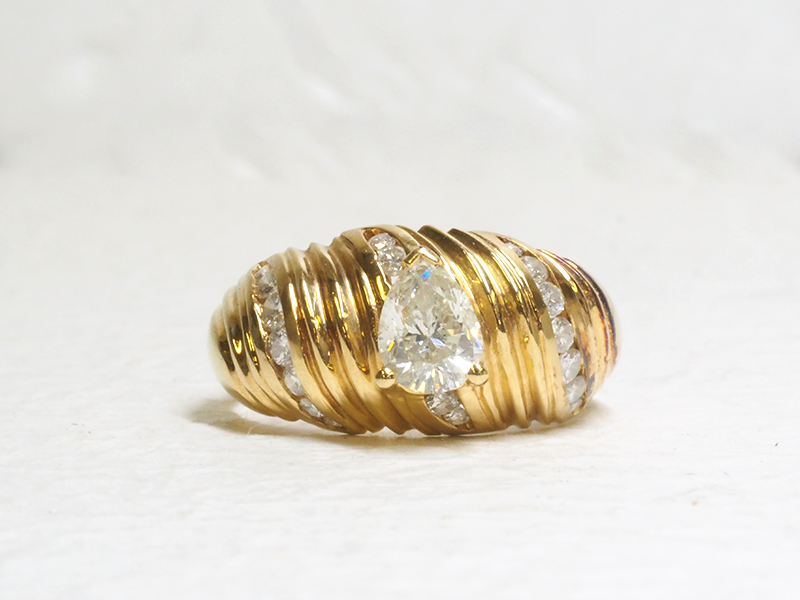 太くボリュームのあるゴールドリングのセンターにセッティングされているペアシェイプカットのダイヤモンドですが、残念ながらせっかくのペアシェイプカットのダイヤモンドが目立ちませんし💦