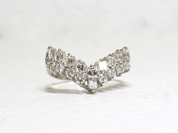 四角や丸のメレダイヤがV字に連なっており、台座の高さもあるし、身につけにくそうです💦