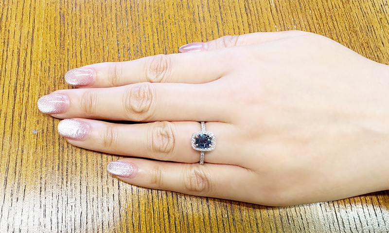 オーバルカットの石をスクエアフォルムのヘイローにするのもスタイリッシュで素敵ですね🥰